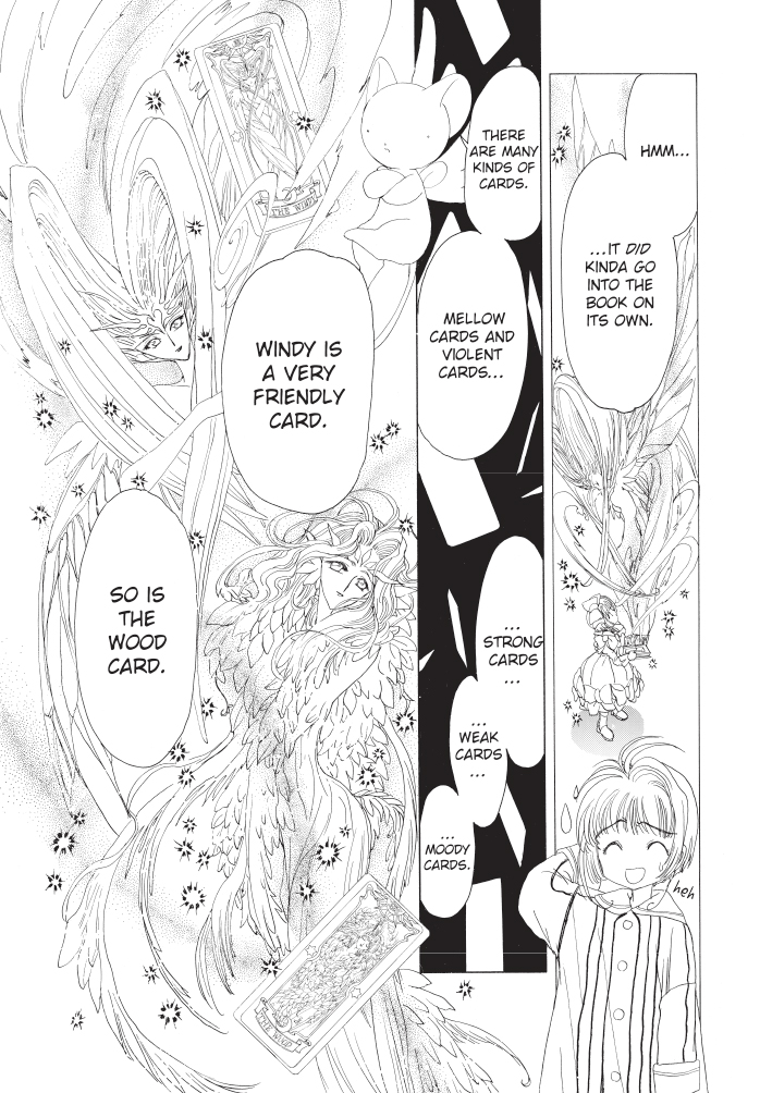 The story jumps right into the action, with our heroine running around the rooftops blasting some weird creature until she captures it into a card. Flashback to a few days earlier: Sakura is a 4th grader who loves P.E. and pancakes and is scared of ghosts. She lived a mundane life until she opened a mysterious old book in the library of her archaeologist father. Out of the book emerges a tiny dog-like talking creature with little wings, which announces that it is the mighty Cerberus, guardian of the Clow Cards. Sakura nicknames the teeny-weeny beast "Kero-chan" and finds out that the Clow Cards are magical card-spirits created by the great wizard Clow Reed. The Clow Cards can take the forms of cards or elemental forces or beautiful women, and they have names like The Sword, The Shield, The Windy, The Mirror, etc. By opening the sealed book, Sakura has proven that she has magical abilities, and therefore it's her responsibility to help find the missing Clow Cards that have escaped into the world and are causing mischief.