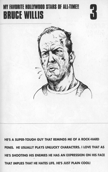 Masayuki Taguchi (Battle Royale, Lives) is clearly having fun drawing this orgy of boobs and violence. His art is polished; the men look like action figures, the women look like sex dolls, and he never misses an opportunity for gore. The backgrounds are detailed and everything looks generally snazzy. His style of character art is rather Western, with his superhero-esque square-jawed hero and his cheesecakey, busty, not-at-all-moe women. He also includes pretty good bonus material, particularly author notes about editorial feedback and his creative process. At one point he reveals that his original idea was to have Baron Gong be a Neo Hume who turned against his own kind, but his editors decided he'd be easier to empathize with if he was just a human with a few Neo Hume powers. (Sort of like how Naruto was originally supposed to be an actual fox spirit.) The best notes are in volume 4, where he does a series of realistic portraits of American movie stars. Sylvester Stallone ("'Rocky' always makes me cry…"). Arnold Schwarzenegger. Sean Connery ("When he was 007, he was a sexy guy, but I think he's a lot sexier now that he's older!"). Or best of all, Bruce Willis ("He's a super tough guy who makes me think of a rock hard penis.") THIS IS AN ACTUAL QUOTE.