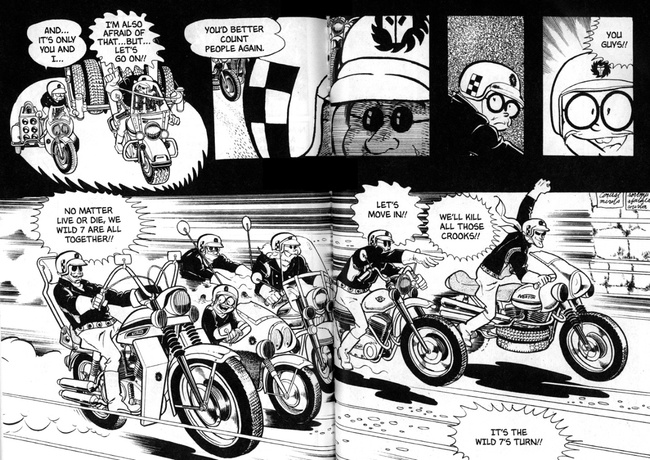 Wild 7 (no relation to the 2006 American movie of the same name) is the story of a band of seven motorcycle cops who hunt criminals that the law can't touch. Answering only to a shadowy ex-policeman who funds them with mysterious sources of income, they're antiheroes one and all, all of them with a dark backstory and deadly talents. ("To qualify for the Wild 7, you must first, be a villain and second, have a worthy skill.") Hiba, the leader, is an ex-reform-school kid. Don ("oyabun" in the original Japanese) is an ex-yakuza. Backfire ("Ryogoku" in the original Japanese) is the buck-toothed, nerdy demolitions expert, whose bike has a rocket launcher for a sidecar. Hippy Tom, the beardy strongman with John Lennon glasses, is a would-be revolutionary who had to go on the lam after blowing up a bunch of planes at one of America's Japanese military bases. Each of them has their special motorcycle and their special gun, and they aren't afraid to use them. They drag crooks behind their bikes for punishment, and dangle them over the edge of skyscrapers (like Batman in Frank Miller's The Dark Knight Returns) to extract a confession. They have to be tough, because in the world of the Wild 7, the crooks control the politics, the courts and the media. In the first chapter, Hiba chases down an oily criminal who just got out on bail, and pulls up next to the guy's limousine, pretending to be a traffic cop. "I've come to erase you," he tells them. "You mean arrest, not erase," say the crooks, laughing about how they're just going to pay some stupid traffic ticket and get off scott free. "No—I meant ERASE!!" Hiba shouts, and whips out his gun and blasts them to pieces.