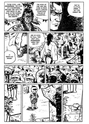 Reading Lone Wolf and Cub is like losing yourself in a pile of beautifully illustrated books about Japanese history, full of artwork and information about every aspect of life in that time. Koike shows every side of culture from the richest to the poorest: Ogami goes to prison, he works in a loincloth as a lowly hadaka-mushi river porter, he lives as a Rice farmer in a peasant village, humbly planting shoots of Rice. He meets monks, gamblers, prostitutes, lumberjacks, thieves and mercenaries and lords; some corrupt, some honorable. He travels to the deep forests, To the Sea, to the rivers, to the cities. There is much talk about meifumado and bushido, samurai philosophy and Buddhist lore. With so many stories, Kojima reuses the same character designs a lot (realistic artwork means a lack of crazy hairstyles), but who cares? Kojima puts the same care into the background that he does into the people. From an era before Google Imagesearch, it's jaw-droppingly well-researched and detailed, and with not a single traced photo. Every line of art is meaningful. As Kojima himself said in an interview in issue #52 of the old magazine Comics Interview: "You have to create a drama—even when you draw a tree or a stone."