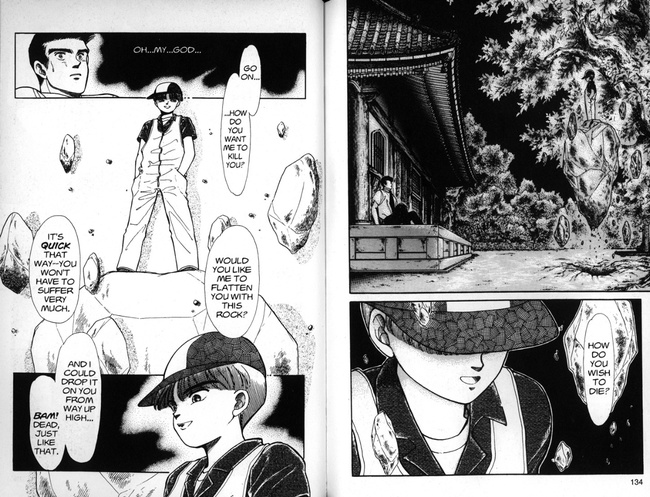 As the main characters deal with their issues, the regrets and loves of their past come back to haunt the living, which is especially weird when the new Shion is a 7-year-old boy and the new Mokuren is a 16-year-old girl. But I won't judge Hiwatari; the young boy-older Girl Crush in Please Save My Earth is just turnabout from the other 98% of manga where some twentysomething guy is in love with some teenage moe girl. (Just give Shion and Mokuren 20 years, and it'll all seem perfectly acceptable. Really. But until then, yeah, it's still creepy.) Still, this manga goes to some dark places; things get very uncomfortable, very fast, in the flashback to Shion's past in volumes 8-10. Some people might not be able to get through it, but it's undeniably got some powerful emotional scenes involving some flawed characters. (There is also an interesting effect when we see the same scene over and over from the perspective of different characters.) Rin's mother, who slowly watches her young son's personality change into some unrecognizable new person, has a few especially touching moments. One of the major plot points hinges on that big question about reincarnation: are the new incarnations doomed to follow in the paths of their predecessors, or are they really new people? Is the past a burden or a blessing? "You're a human on earth, scheduled to come out of his cocoon, with your old self as a stepping stone," one character tells another. Or as another person says, "The past is just a tool for us to use. It's not essential for living in the present... but it can come in handy from time to time. Think of it like reference material. It's the simplest way to understand yourself. That's all it is. It doesn't change who you are."