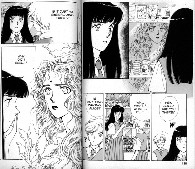 Although they have psychic powers, the alien scientists aren't gods, and Hiwatari does a good job fleshing out their backstory. (One minor detail which is mentioned once or twice is that the aliens were actually only a few inches tall, which is why their moonbase hasn't been noticed by human telescopes; I think having the moonbase just be buried or invisible would've been a simpler explanation than having the aliens be a race of tiny elf-people observing a planet of ginormous humans, but let's just run with it.) The seven scientists are from a war-torn world, and to them, Earth seems like a green paradise, an unspoiled piece of nature they must watch over but never interfere with. (I was reminded a tiny bit of the old sci-fi film Silent Running.) But this isn't one a preachy environmental manga; it's much more of a character story. Mokuren, the previous incarnation of Alice, is a Kiches Sarjalim, a virgin priestess raised in a secluded sanctuary, who loves plants and living things. Gyokuran, one of the men who loves her, admires her nobility and puts her on a pedestal. In contrast, Shion is a war orphan, whose terrible childhood has made him grow up cynical and misanthropic. He is baffled by Mokuren, who seems so saintly and privileged. ("Such people exist? They're allowed to exist? How can the world be so unfair…?") Shion is drawn towards her…but is what he feels for her love or hate? But Mokuren isn't as pure and simple as she seems on the outside, and when we finally see inside her head, we realize that she's also got flaws.