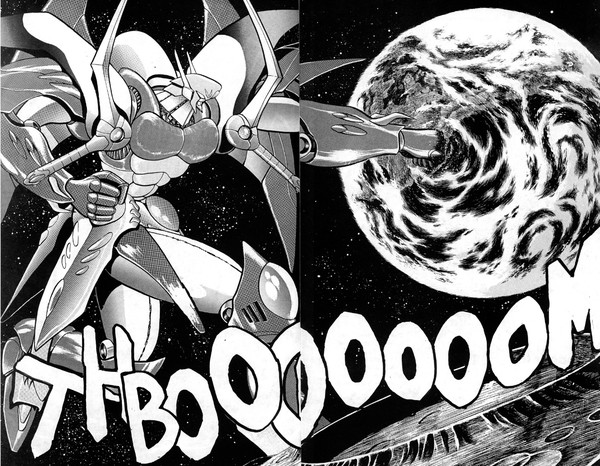 Takuma, whose vocabulary would get the manga an 18+ rating if it were published by Viz, is not happy to see Ohkizon. ("Shit…what an asshole!") Ohkizon grabs the Earth and challenges Takuma to a volleyball game using the planet as the ball! More destruction ensues, and finally Takuma gets the upper hand on his opponent and prepares to deliver the final blow. But then Koyori begs Takuma to stop. "No, Takuma! Even if you destroyed Ohkizon, the author—I mean the Zogelians—would just send Bigger Ohkizon, Even Bigger Ohkizon, Biggest Ohkizon, and Bigger Than Ever Ohkizon!" Koyori promises to keep Takuma from being so destructive, and in return, the Zogelians agree not to keep trying to destroy the planet. Thus, peace triumphs, although the pilot of Ohkizon sucker-punches Dodekain once for payback before he leaves.