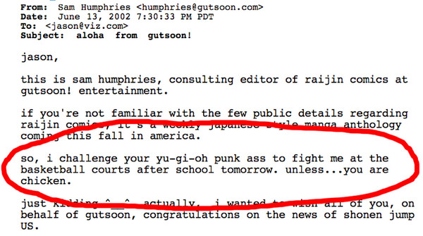 Actually, like in any good shonen manga, the delightful Sam Humphries and I became friends after our battle, and he's now working as a comic book writer. I also shook hands once or twice with Jonathan "Jake" Tarbox, Sam's boss and the true Raijin overlord on the American side, who later went on to work for CMX and as a freelance translator. But the overall feeling between Raijin and Shonen Jump at the time was as hostile and competitive as between…well, as between any two big corporations.