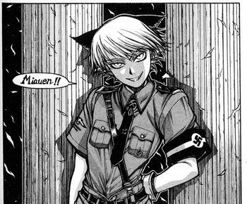 But are Nazi bad guys a cliché? Or even worse? I once heard a rumor that a certain American manga publisher had passed on licensing Hellsing because they thought it was anti-Semitic (in the anti-Jewish sense, not the literal anti-Jews-and-Arabs sense); not that Hellsing even has any Jewish characters, but they thought Hirano made the Nazi villains look "too cool". Which leads to the eternal question: is it a bad idea to have sinister, sexy, well-dressed Nazis as villains? When are Nazis appropriate bad guys, and when are they arguably inappropriate bad guys? What if one of the Nazis ends up teaming up with the heroes against some even eviller bad guy, like in Jojo's Bizarre Adventure: Battle Tendency? What if there's a good guy who wears a vaguely Teutonic military uniform and represents World War II Germany but somehow isn't supposed to be a Nazi? Oh, I know what would make it more tasteful—what if there's a bad guy with a swastika tattoo fighting a good guy with a Star of David tattoo? MY BRAIN HURTS. Do Americans and Japanese people need to start obsessing over new bad guys like the Khmer Rouge or something?