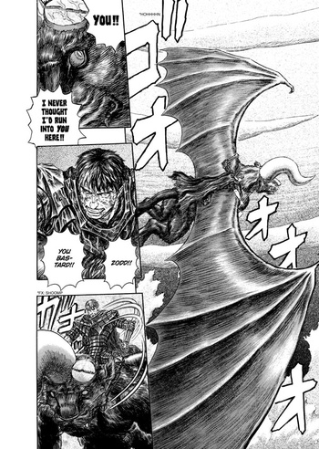 In this world is one man who knows about the Apostles and tries to kill them. He's a haunted-looking man in his twenties who wanders the world with a giant sword strapped to his back, a sword about one foot wide and six feet long. "It was too big to be called a sword…it was more like a hunk of iron," people think when they see it. His body is covered with scars, and he is missing an eye. He is also missing a forearm, but strapped in its place is a metal arm with a built-in repeating crossbow and a hand cannon. People call him the "black swordsman," but his real name is Guts. (Plenty of American otaku call him Gattsu, because that's how it sounds phonetically in Japanese, although Miura has written Guts' name in English in the character bios for the last 15 or so volumes. Get with it, people! Also, it's Vegeta, not Bejita!)