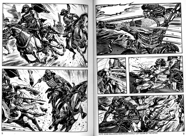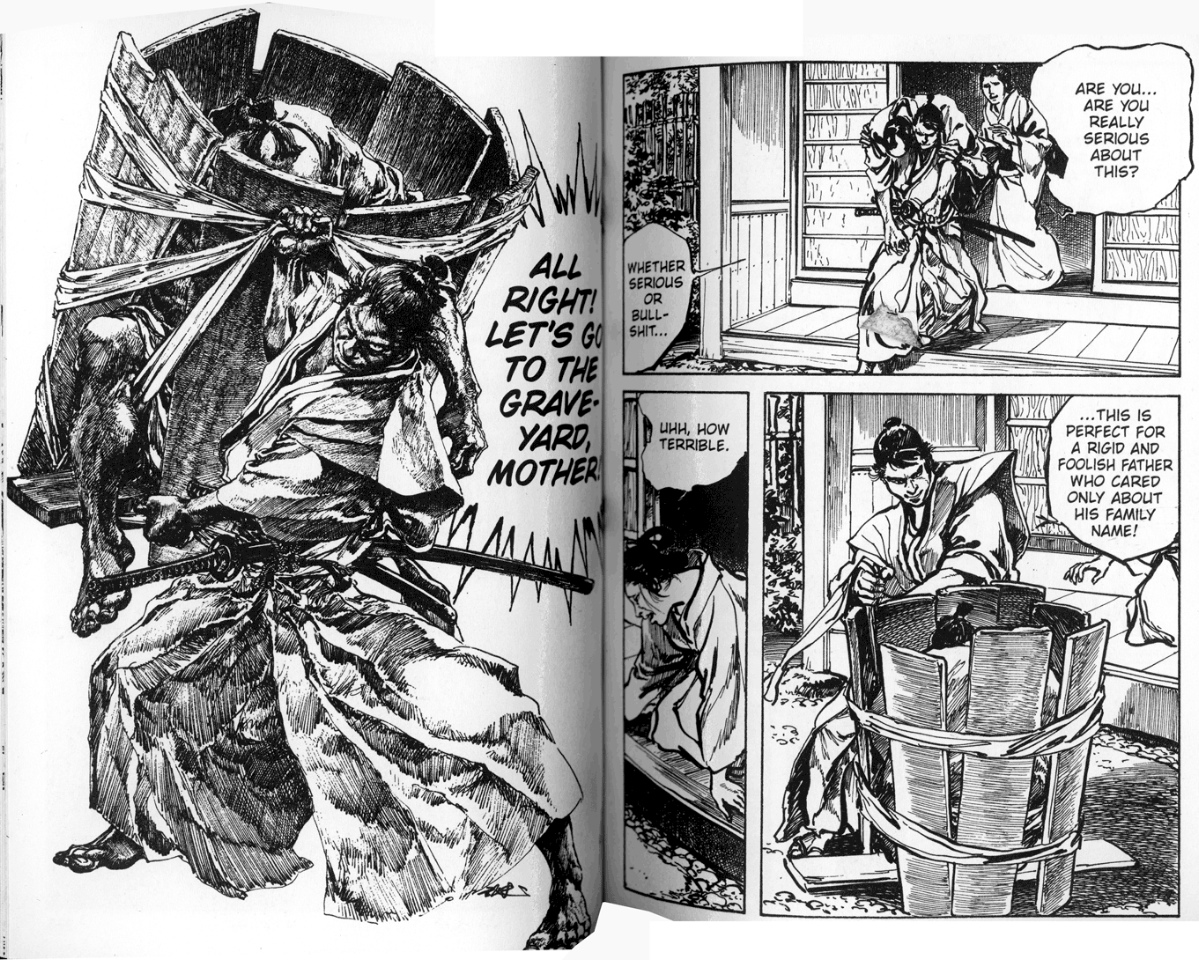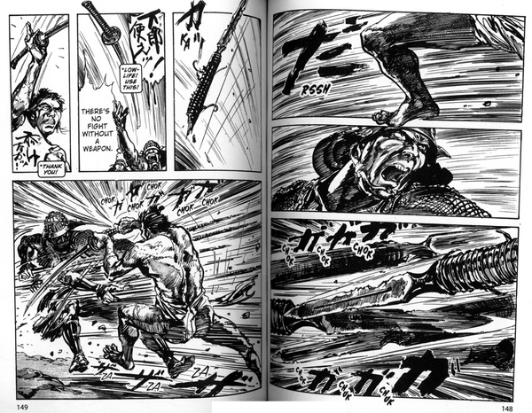 If another mangaka wrote these lines, it might seem like self-parody, but Hirata plays it all straight. (Actually, there's a teeny bit of humor, like when Gondô chews out his fellow samurai for their lame code of chastity: "Your frustrated lust for women makes you masturbate in secret!") Again there's a clear contrast to Lone Wolf and Cub, where the hero rarely says anything; here, the characters shout and scream as if they want the heavens to listen. It's no surprise that Hirata loves his dialogue, since he's also famous for hand-lettering it with bold brushstrokes; most of his hand-lettering is left unchanged in the Dark Horse version, with translations in the margin, since it's more like SFX than mere dialogue.