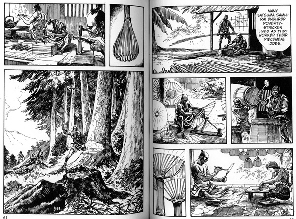 In Manga: The Complete Guide I described Satsuma Gishiden as "an incredibly intense action comic," but I wish I could take it back; after the jaw-dropping 40-page opening fight sequence, honestly, there isn't that much action. Kazuo Koike, the author of Lone Wolf and Cub, liked to say that "manga was about character"; but Satsuma Gishiden really isn't about character either. Satsuma Gishiden is about the world. The real point of the comic is tons and tons of history and exposition about the samurai world and Tokugawa-era Japan. In one volume, there's an 8-page explanation of the consequences of the Battle of Sekigahara and what it meant for Satsuma. (This story is apparently partially based on facts; it's historical fiction, at least more so than Lone Wolf and Cub is.) In another volume, there's a 10-page sequence just showing the gôshi working at their professions: treecutter, carpenter, farmer, geta maker, paper maker, etc.…It serves no story purpose, but it feels like Hirata is waving his fist at the audience and shouting "JUST TRY TO FIND SOMEONE WHO KNOWS MORE ABOUT THE TOKUGAWA ERA THAN ME! I DARE YOU!"