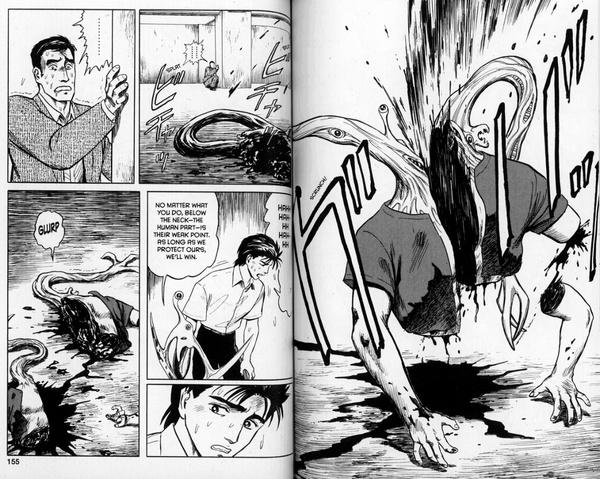 The Parasytes are some of the most interesting manga monsters I've ever seen. In his author's notes, Iwaaki writes that he tried to make the Parasytes "both scary and a little humorous." Certainly, the Parasytes never look "diseased" or "gross", with slimy textures and weird stuff sticking out just for decoration, like some of the things H.R. Giger draws: they look natural. (Incidentally, according to a New Yorker interview, "natural" was also one of Guillermo Del Toro's guidelines for designing the shapeshifting shoggoths in his aborted film adaptation of At the Mountains of Madness.) The horror comes from seeing normal-looking human faces transform into alien shapes (like on the creepy front covers of the Del Rey edition), but when the transformations are finished, their forms are actually simple and streamlined (logically, and also conveniently for Iwaaki's art style). Their main weapon is their speed; moving too fast for the human eye to follow, their heads turn into tentacles like long lashing sword-whips, slicing people to pieces. They can dodge bullets (sometimes) and catch knives and swords in mid-swing. Their only real vulnerability is the human part of their bodies, but being impervious to pain, they can keep going for a long time even when their human body has been mutilated. In one scene, a Parasyte turns its entire head into a whirling propellor and carves up the head of a lion: the apex predator finally met something higher up on the apex.