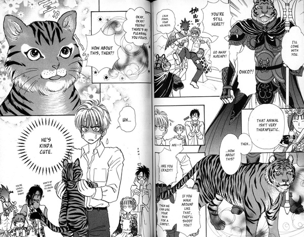 Of course, all of these new powers aren't just wish-fulfillment, they also prove Fuuto's qualifications to be the true king. And if Fuuto is really a reincarnated tulku, or perhaps a Bodhisattva, it makes sense that he's badass. Lord Naga keeps sending enemies to kill Fuuto, but one after another, they switch sides and become Fuuto's allies: Hanuman the monkey spirit, Genro the wolf spirit, Yamantaka the bull. Lamia the snake spirit is one of the toughest opponents, but even Ohko, the warlike tiger spirit with a Worf-like personality, gets tamed and turned into a kitty-cat so damn cute I wish he had his own spin-off manga. None of these characters have any experience with modern technology or modern Japan, leading to many attempts at fish-out-of-water comedy ("So…what is this 'Valentine's Day'?") Soon, Fuuto is surrounded by allies, but the people closest to him are Garuda, Professor Ichijo the parapsychological researcher, and Mayu, a mysterious, emotionless girl in a wheelchair. Out of these three characters, two have dark secrets. In volume 4, Fuuto learns out-of-body projection, and finally travels to Dhalashar where he meets the false king, Lord Atisha himself. But to Fuuto's surprise, Atisha turns out not to be an evil final boss, but a fairly sympathetic person not too unlike Fuuto himself, and gifted with equally awesome powers. Could Atisha be the true king after all? And is being the king of Dhalashar, forever meditating behind the walls of a remote castle, a gift or a curse?