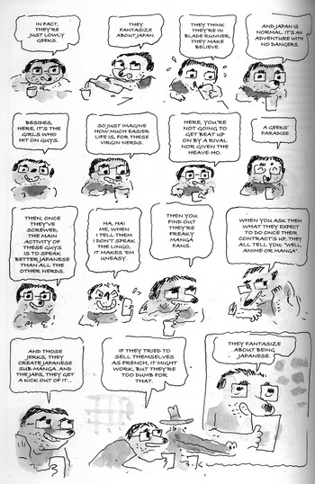 Tourists, like everybody, have their biases; they all write about the food, about the hot springs, about Sanrio or Mr. Sparkle or some other cutesy pop culture thing, and they all check out the Japanese women. (Even Fabrice Neaud, who is gay: "This remains however a purely intellectual outlook, as I do find slipping into the role of a heterosexual male very tiresome.") There's a recurring theme of Westerners hitting on Japanese girls, mocked in Joann Sfar's story ("They land here and it's like the big adventure. They teach three French classes, screw a Japanese girl and think that they're Francois Truffaut!"). It's reversed in Emmanuel Gilbert's illustrated-prose story about a studio of Japanese artists, one of whom is a Francophile ("More obsessive too was his love of France, extending to anything that came from that country provided the fragrance of Frenchwomen was involved…").