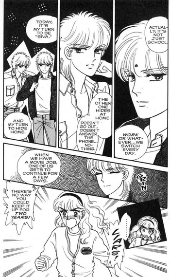 One day, Anise follows him back to his apartment, and discovers his secret: his twin brother Cipher. It's common knowledge that Siva has a brother, but what no one knows is that they switch places regularly, playing whichever role is convenient for them that day. Anise is confused and a little angry. ("How can you do this? You've been lying to all your friends!") The twins make a bet with her: if she can tell them apart after two weeks, they will tell her the reason why they share one life. If she can't, she has to promise never to tell anyone their secret. Anise asks for one extra condition: she needs to spend more time with them first. "Even if I come back with you after school, I still only get to see you three hours a day, tops! I'm gonna move in here for two weeks!"