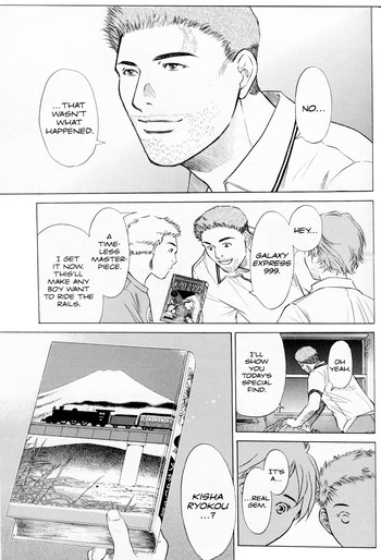 In each chapter, a customer comes into Kingyo with a personal problem—a problem which can only be solved by the application of the correct manga. Examples: A strung-out bar hostess connects with a lost little girl by reading manga adaptations of classic children's books by Kenji Miyazawa (known in the U.S., if he's known at all, for Night on the Galactic Railroad). A non-nerdy guy figures out how to talk to a nerdy girl by tapping into their shared love of Ranma 1/2. A disaffected tween is shocked out of boredom by the horror of Devilman. A politician is revealed to be a secret manga fan with a thing for Crying Freeman. And on and on. Although the stories are episodic, many of the characters go on to become regulars at Kingyo, so as the series progresses the store gets busier and the relationships more complicated.