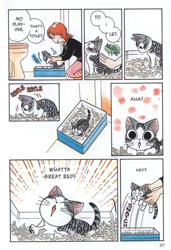 Chi's Sweet Home, while very different from What's Michael?, is a bit more of the second type of pet manga. Chi is adorable, but she's an adorable animal, not an adorable person. She's often confused. She lives in the moment and has a poor memory. She loves hunting prey, although she's not very good at it. And although she's got a sweet personality, once in awhile, she gets angry (like when she has to go to the vet) or possessive. Here are some real cat things that Chi does:
