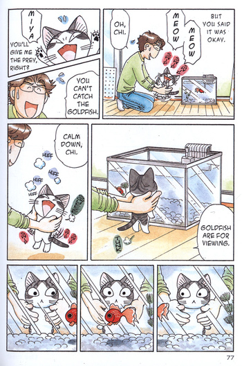 Unlike Chi, the other cats don't talk in baby talk, and they generally seem less scatterbrained; Chi's ADD is partly just her personal thing, and not quite a comment on cats in general. A wordless story about non-talking cats wandering around through a perpetual haze of smells and impressions would probably not be very easy to write, or very fun to read. But there's parts in Chi that are very specifically catty, and also very sad; the sadness of being an animal who's little and often powerless and doesn't understand the world. When Chi's family moves to a new apartment, Chi is confused by the unfamiliar sights and smells. When she hides inside the sock drawer and someone shuts it without knowing she's there, it's suspenseful, or dare I say scary? And biggest of all, there's the sadness that Chi has lost her mother. At first, she just wants to go home to mommy, but midway through volume 1, she forgets her mother and thinks she's been with the Yamadas her whole life. (My wife and I also own a dog who was a stray; I tell people that when we found her she had amnesia and couldn't tell us about her past.) When Chi settles off to sleep in Yohei's arms, it reminding her of cuddling with some big warm furry thing, but she doesn't even recognize the memory anymore. The big unanswered question in the manga is if she will ever be reunited with her mother. (Another question is whether she will ever grow up: I know this manga operates on Sazae-san time, but so far, she's been a kitten for 9 years.) In her deepest dreams she remembers her mother, imagining herself turning into a drop of water and melting blissfully into the rippling pool of mama. This is the first time a cat comic has ever reminded me of Neon Genesis Evangelion. Show me an American cat comic that has MONO NO AWARE, and I'll give you a prize.