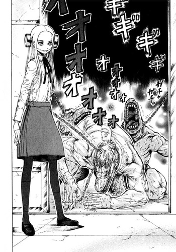 If this group wanted to be evil, the world would be in trouble. But don't worry! They don't. Honest. Like the very best mad scientists, Fran doesn't have some limited goal like "defeat the aliens" or "achieve human Instrumentality"; she's an idealist who wants to use science to better the world and save people's lives. In this way, she's a lot like Black Jack, Osamu Tezuka's stitch-faced super-surgeon; in fact, many Franken Fran chapters are basically riffs on Black Jack, beginning from the first chapter in which a rich man asks Fran to save his son who died in an automobile accident. The difference, however, is that Fran could use lessons in "quality of life"; she cares only about keeping people alive, no matter what hideous, disfigured form they're kept alive in. "I can't allow anyone to die if I can keep them alive!" She's not trying to hurt people, she's just got…her own special values. Fran's zealousness for preserving life terrifies even Veronica, the cold-blooded killer, and leaves no doubt as to who's really the scariest person in the manga.