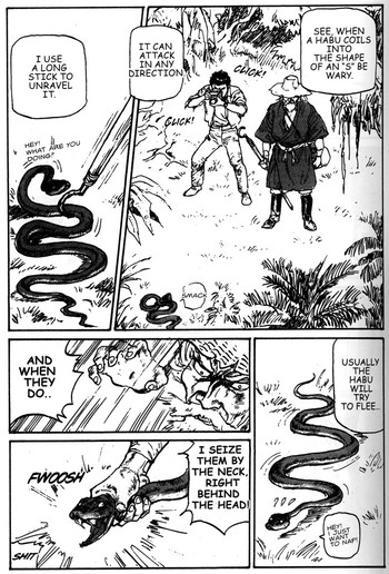 The Habu Hunter is steeped in Okinawa lore, and by exclusion, it's a reminder of how Tokyo-specific most manga are. It's full of great local color, from kankara sanshin musical instruments to detailed drawings of the Okinawan jungles. Isamu Oshiro, a reporter, is assigned by his boss to do a story on Habu snakes ("The unblinking eyes are cruelty personified! The powerful fangs never let go of their chosen prey!"). He goes to a remote village where he meets Niyou, a muscular old man who dwells in a rundown house and lives on canned mackerel and awamori. In another manga, Niyou would be a street-fighting martial artist, but here, he's a Habu hunter, who's spent decades killing the venomous snakes that are a plague to the Okinawan farmers.