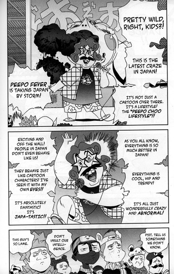 "Peepo Choo," the manga within the manga, is totally bonkers and non-realistic; while vaguely Pokémon-like, it's an explosion of sumo wrestlers, ninja, ramen chefs, and Mt. Fuji, i.e., all mixed-up stereotypes of Japan. (Not to mention the scenes of exquisitely detailed human feet and giant lumps of sh*t spewing out of Peepo's mouth.) The contortionist "Peepo Dance" poses don't have any real-world analogue in otakudom that I can think of (it definitely ain't Haruhi dancing), and feels like something that was included, understandably, to show off Smith's rubber-bodied drawing talents. The terrifying truth that blows Milton's mind, as revealed in flashback, is that "Peepo Choo" was never popular in Japan, being merely a cheap-and-easy-to-get Japanese license scarfed up by the suspiciously Tokyopop-esque company, Japa-Tastic Manga Publishing & Licensing" (whose CEO gives a passionate speech about manga at Wizard World Chicago before going backstage, taking off his otaku outfit and gloating "It's so easy to sell to the otaku crowd!"). Everyone in America loves it, but in Japan, Peepo Choo was a massive failure, one of the sort of obscure indulgent cult manga Manga Zombiewas written about; the creator, ringo Plum, even was said to have killed himself afterwards.