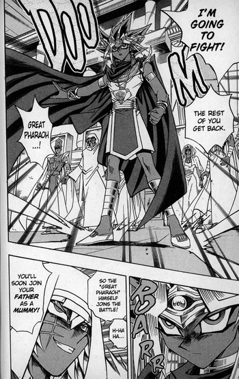 Yu-Gi-Oh! changed its mood and theme when it became card-centric; then, before the end, it changes again. The 24-volume-long Duelist story arc (really two arcs, "Duelist Kingdom" and "Battle City", with a non-card-game "Dungeon Dice Monsters" interlude inbetween) leads up to the climactic 7-volume arc, "Millennium World", which is totally different from what came before. The question that's been on readers' minds since the first chapter—what is Dark Yugi? Is he Yugi's self-esteem-building alternate self? Or is he some creepy ghost monster?—is answered here. (The answer is, "Yes on self-esteem, and yes on ghost-monster.") Turns out that Dark Yugi, the partner in Yugi's body, is the spirit of an ancient Pharaoh from 3000 years ago who somehow lost his memories and became a ghost tied to the Millennium Puzzle. (3000 years ago would've been towards the end of the New Kingdom of Egypt—actually pretty recent in Ancient Egyptian terms. The English anime changed it to 5000 years ago, which I have to admit actually makes sense; I also give the 4Kids people props for using actual linguistically correct Ancient Egyptian in Yu-Gi-Oh!: The Movie, thereby throwing extra bucks at some starving Egyptologists.) With the Millennium Items and the God Cards gathered, the modern-day characters spirit-travel back in time to Egypt (or, more accurately, into Dark Yugi's memories of Egypt) to discover the pharaoh's forgotten memories and the origin of the Millennium Items. The series becomes a full-on fantasy adventure with an Ancient Egyptian setting, and the 'card game' element is abstracted into battles between priest-magicians who summon monsters to fight. Weird things happen. Surprising plot twists are revealed. Finally, the relationship between Yugi and his other self, and their character arc, is resolved with resounding finality.