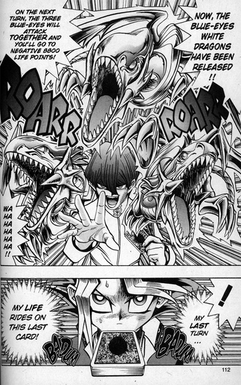 But of course, Yu-Gi-Oh! is just a children's entertainment franchise. Even in Japan, it was censored from edition to edition, such as changing the monstrous Zorc Necrophades' dragon-penis in the final story arc into a mere dragon-tail. But considering that we at one point weren't allowed to use the word "darn!" due to Viz's language requirements for All-Ages titles, the visuals in the English manga are surprisingly uncut. (Trying to be sensitive to racism, we also cut the line when Jonouchi calls the villain Shadi (an actual Arabic name, BTW) a "turban yaro". Yu-Gi-Oh! has plenty of stereotypical Egyptian characters , from skulking mooks like the bad guys in the first Indiana Jones movie to Bobasa, the subservient big fat guy who hangs out for part of the final story; I suspect that even someone in Japan complained about Bobasa and that's why he vanishes abruptly without explanation in the middle of the final story arc. OTOH, the anime and cards were apparently reasonably successful in Arabic, Isis Ishtar may be the only anime heroine who wears something vaguely like a hijab, and the final "Millennium World" story arc has more dark-skinned good guys than just about any manga I can think of.)