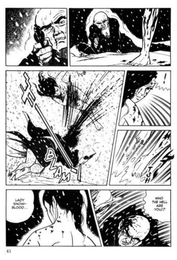 Snow, darkness, women, swords: Lady Snowblood's biggest mark on America was the fight scene at the end of Kill Bill Vol. 1. The heroines face off in a snowy backyard, spraying sparks and spilling blood, and it's a ghostly parallel of a scene in Lady Snowblood. Even the fact that it's obviously filmed on a sound set, like the film, only makes it more manga-like; as unreal as Kazuo Kamimura's artwork, as ritualistic and dead-serious as a play. Of course, Quentin Tarantino was influenced by the 1973 film adaptation, not the original manga, just like how Shogun Assassin inspired a wave of American samurai-themed films in the 1980s. And both Shogun Assassin (aka Lone Wolf and Cub)and Snowblood are based on manga written by Kazuo Koike, the most prolific, wild, influential men's mangaka of a wild and violent decade.