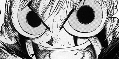 Makoto Raiku is basically a gag manga artist, and the art in Zatch is exaggerated to the point of nonsensicality. When characters' eyes aren't sliding off their faces, they're popping out of their heads. Speed lines are everywhere, emphasizing even the most mundane moment. Everyone looks so angular and distorted it's impossible to tell who's a mamodo, and who just looks weird because that's the way Raiku draws humans. At first almost unbearably ugly, gradually Raiku's art refines and becomes more angular and tight (question: is this something that just naturally happens to many manga artists' style over time, or does it reflect the increased use of assistants?). As the power level goes up, the battles become so epic that scalebecomes important. Tiny heroic mamodo go to bat against 50+ foot tall enemies, such as Demolt, who with his bat wings, pointy tail and goat hooves, looks exactly like a traditional demon. Teeny-tiny characters unleash massive energy blasts. The second-to-last major storyline features Faudo, a giant mamodo over a mile high, whom the heroes can only stop by going inside his body and fighting his way through his blood vessels to his brain, Fantastic Voyage style.