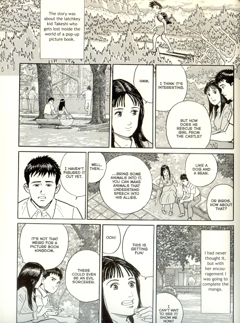 The plot itself is vague, following Hamaguchi loosely through his initiation into the manga industry and his slow development as a manga artist in his own right. At first he's content filling spot blacks for a pro; gradually, he develops the itch to create his own manga. But his dreams of becoming a manga-ka remain idle fantasies until he meets a sickly girl his age who collaborates with him on manga plots. The introduction of a love interest takes the manga in a sentimental direction that some readers may find saccharine, but personally I'm a sucker for characters bonding over comic books. Go, comic books! Save lives and give young people meaning and purpose!