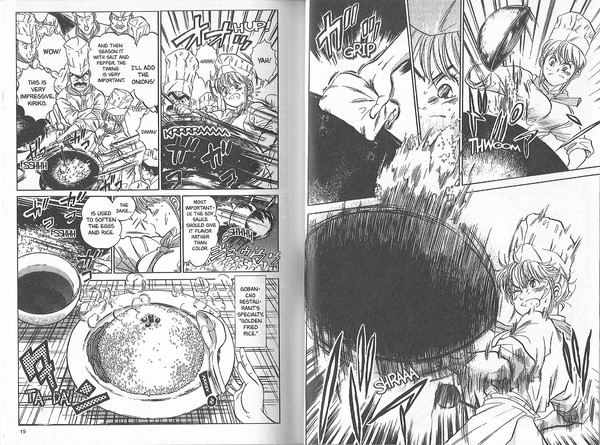 This manga also taught me to cook. Perhaps unfortunately, most of the recipes in the series are too over-the-top to teach anyone anything (I've rarely cooked ostrich meat, let alone had to worry about how to kill an ostrich humanely without frightening it with my intense bloodlust so it releases tons of fear pheromones and ruins the taste), but early on there's a scene where the creators basically say “Look, stupid, here's how you actually cook food” and draw a several-page sequence of one of the characters making green pepper beef. I was bored one night, so I followed the recipe in the manga, and now I cook almost every day. As much as I love other shonen manga, I've never read a martial arts manga and then said “Yeah! I better go do some pushups!”