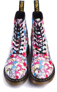 As part of Sanrio's 50th anniversary celebration, shoemaker Dr. Martens has announced a collection of three Sanrio-themed shoes. These shoes include a black and pink Hello Kitty lace-up boot (US$135), a similarly-colored Mary Jane-style shoe (US$120), and a lace-up boot with a special print featuring Sanrio characters such as Hello Kitty, ChocoCat, My Melody, and others (US$165). Each shoe is currently available for pre-order and will ship "after 9/1/10."