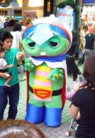 Gachapin also has a second identity, "Gatchapin," which is the buck-toothed green dinosaur dressed up as a character from the 1972 Gatchaman anime. This version was later immortalized in figure form. Gachapin also made a cameo in the “Read My Mind” music video by the American rock band The Killers.