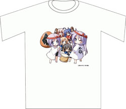 The t-shirt features Lucky Star characters Kagami and Tsukasa Hiiragi, Konata Izumi, Miyuki Takara, Patricia Martin, and Hiyori Tamura, as drawn by Yoshimizu himself. The characters are all dressed in happi (festival coats) and other festival attire, and they also carry instruments and lanterns.