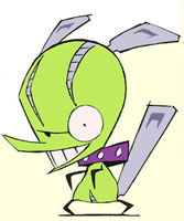 Jhonen Vasquez, an American comic artist who created the animated television series Invader Zim, has posted about the new fall Gainax television anime Panty & Stocking with Garterbelt this week. Specifically, he talks about the Panty & Stocking character Chuck (pictured at right), a green dog who bears some similarity to GIR (pictured at far right), a robot in a green dog costume who appears in Invader Zim. In the post, he comments that Panty & Stocking:
