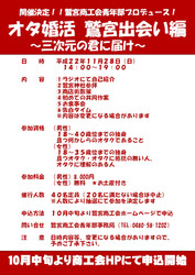 Male applicants must be between the ages of 18 and 40 and "otaku of some kind of hobby." Female applicants must be between 18 and 35 and "be otaku, be tolerant of otaku, or be sympathetic to otaku." There is a 8,000-yen (about US$100) entrance fee for men — but women can enter for free. A maximum of 40 participants will be randomly selected from the applicants. The chamber's home page will begin accepting applications in mid-October.