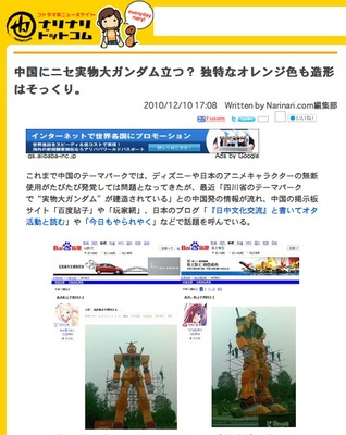 The "Nicchū Bunka Kōryū" to Kaite Ota Katsudō to Yomu blog and Narinari.com website posted images of the statue during construction, while a user on the Photobucket website posted an image of the completed statue. Chengdu Guosetianxiang's statue is shorter than the 18-meter-tall (59-foot-tall) Gundam statue that once stood at Tokyo's Odaiba Island and now stands in the central Japanese city of Shizuoka.