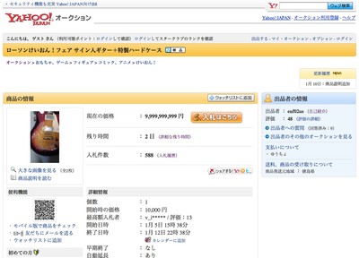 A seller named "euf02us" placed a guitar signed by the K-On! anime's voice cast on auction on Yahoo! Japan on January 5, and a user placed a 9,999,999,999 Yen (about US$120 million) "bid" on Monday morning.