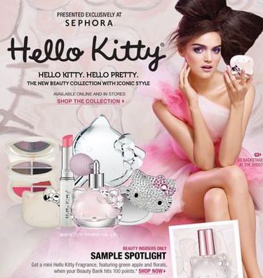 In an e-mail newsletter, cosmetics retail chain Sephora announced that it is launching an exclusive Hello Kitty line of products this month. The line includes cosmetics in branded Hello Kitty-shaped cases, perfume in a Hello Kitty bottles, and various accessories, including a scented necklace. Prices range from US$5 for nail art stickers to US$55 for the Hello Kitty fragrance. Sephora website customers can also receive a free sample of the fragrance in a corresponding Hello Kitty bottle if they have earned 100 reward points (by spending US$100 or more at the site).