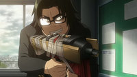 An unidentified cosplayer portrays Kouta Hirano, a character from Daisuke Satō's manga Highschool of the Dead and its 2010 anime adaptation. In the series, Hirano is a gun and weapons fanatic who joins a small group of schoolmates in defense against a horde of zombies. His name and obsession with guns are supposedly based on those of the creator of Hellsing, also named Kouta Hirano.