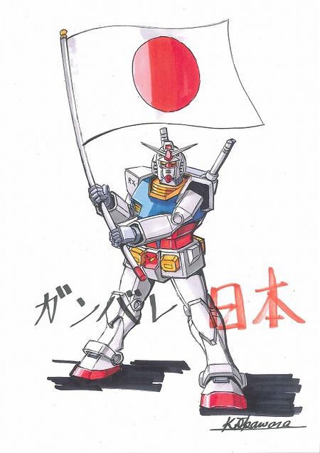 On March 14, the veteran mechanical designer Kunio Ōkawara (Gundam, Votoms) posted the above image of Mobile Suit Gundam's title robot to encourage Japan and to thank the nation's Self-Defense Forces and others involved in the reconstruction after the Great Eastern Japan Earthquake disaster (Higashi Nihon Daishinsai) three days earlier. He then posted the image below of the Yatterwan robot from the Yatterman anime series on March 23.