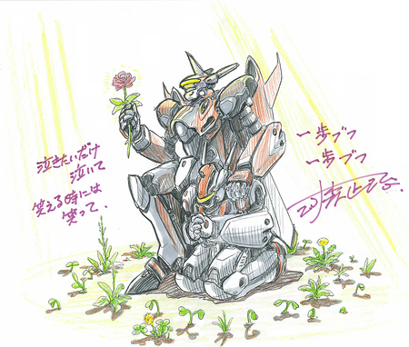 Mechanical designer and director Shōji Kawamori (Macross, Escaflowne, Aquarion) also posted an illustrated message of support via the Twitter account of Kadokawa's Sneaker Bunko imprint on March 22. Kawamori was born in northwestern Japan, and he directed Ihatov Gensou: Kenji no Haru (Spring and Chaos), an anime based on the life of acclaimed author Kenji Miyazawa (Night on the Galactic Railroad). Miyazawa was famous for his devotion to Buddhism, social activism, and preserving the way of life in Iwate, a northeastern prefecture hard hit by the earthquake.
