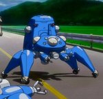 In the above photograph, an unidentified cosplayer portrays Major Motoko Kusanagi, the protagonist of Masamune Shirow's Ghost in the Shell manga and its anime adaptations and spinoffs. In the series, she is the squad leader for Public Security Section 9, a (fictional) division of the National Public Safety Commission of Japan. The cosplayer is accompanied by a miniature version of a Tachikoma, a fictional walking/rolling artificial intelligence (A.I.) robot from the Ghost in the Shell: Stand Alone Complex anime. Tachikoma can be unmanned but can also be controlled either remotely or via a pilot in their cockpit.