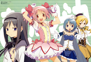 In the above image, unidentified cosplayers in Taiwan portray the characters of Mami (left), Madoka (center), and Sayaka (right) from the magical girl series Puella Magi Madoka Magica. In this series from the anime studio Shaft and director Akiyuki Shinbo, the girls have formed contracts with Kyubey, a mysterious creature who grants each girl the power to transform into a magical girl called a "Puella Magi." In exchange for these powers, the girls must fight witches. (Pictured at right but not cosplayed is Akemi, another Puella Magi.)