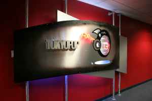 The ads are for the sale of two lighted signs, both featuring Tokypop's name and "robofish" logo on metal. One sign is four inches deep and 2.5 feet by 3.5 feet (10 by 80 by 100 centimeters), and the other (pictured) is much larger: 11 feet by 8.5 feet (3.4 by 2.6 meters).