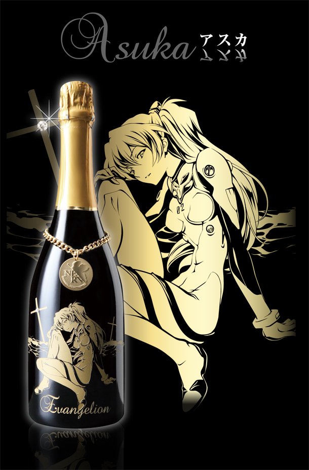 "Evangelion Sparkling Eva 01 BRUT Karakuchi" is a dry, not very sweet wine; "Evangelion Sparkling Eva 00 SEC Nakaguchi" features Rei Ayanami and is a semi-sweet wine; and "Evangelion Sparkling Eva 02 DEMI SEC Amakuchi" is a sweet wine featuring Asuka Langley. All three bottles feature the characters drawn in gold print on a black bottle.