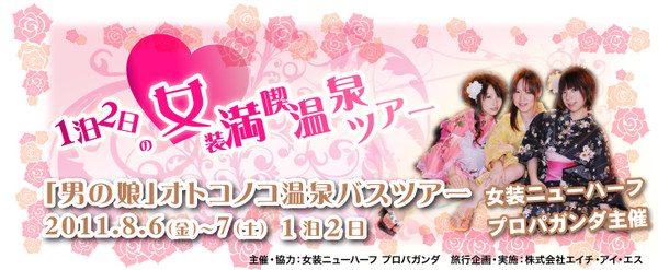 The Japanese travel agency HIS has announced that it is launching a two-day, one-night hot spring tour designed for cross-dressers — specifically those identifying themselves as otokonoko (literally, "male maidens"). Both the staff and tourists will be otokonoko, allowing participants to enjoy the trip without embarassment. The tour originates in Tokyo and travels by bus to the Hotel Shinko and hot spring. The trip costs 27,800 to 32,800 yen (about US$344 to $405) and will take place on August 6 and 7.