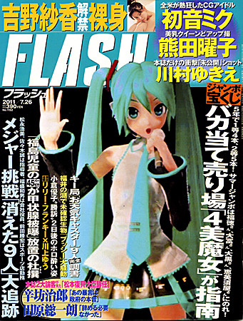 On Tuesday, the virtual idol character Hatsune Miku appears on the cover of Kobunsha's weekly photo magazine Flash — the first time that any fictional character has been featured on this national magazine's cover in its 25-year history. To mark her first overseas concert at Anime Expo last week, Flash put its title logo in Hatsune Miku's signature blue-green color. The magazine's feature article noted that Hatsune Miku is now part of the ranks of Japanese idols, having performed at Anime Expo one year after AKB48 and two years after Morning Musume.
