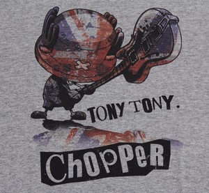 Oricon is also selling collaborative One Piece shirts with the Hawaiian casual brand Sr'es Rainbow. Each of the two styles offered are made of jersey cloth. The first T-shirt has a picture of the character Chopper wearing colors of the Union Jack flag and holding a guitar. The shirt comes in grey, white and custard colors, and will cost 5,040 yen (about US$63).