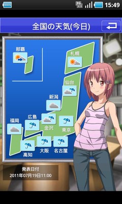 The application has different characters providing the user with the national weather for Japan for the current day and the next day just like a morning television program. The characters also provide local and weekly weather forecasts. In addition, the characters will also provide the user with a daily fortune. The app will also have a special event on days like Christmas.