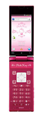 The Android 2.3 flip phone features a touch screen and a Hello Kitty theme for its menu screen, wallpaper, e-mail decorations, calculator, and alarm clock. The phone's display screen has a swivel mechanism, allowing users to rotate it 180 degrees to hide or use the keypad. The phone is also capable of recording high-definition (1280x720-pixel) video and receiving Japan's 1seg television reception.