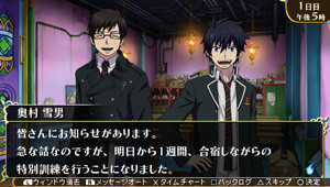 The official website for the Blue Exorcist anime announced the "exorcist x kizuna (bonds) adventure" game in June. In the game, the player will be able to switch between playing as the characters Rin Okumura and Yukio Okumura. The game will also feature an original story.