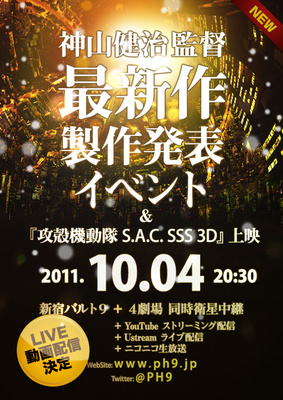The YouTube, Ustream, and Nico Nico Douga services will all be streaming the announcement for free on October 4 at 8:30 p.m. in Japan (7:30 a.m. EDT). To show their appreciation to their fans, the staff of the Ghost in the Shell: Stand Alone Complex: Solid State Society film will also stream the 2D version of the film for free.